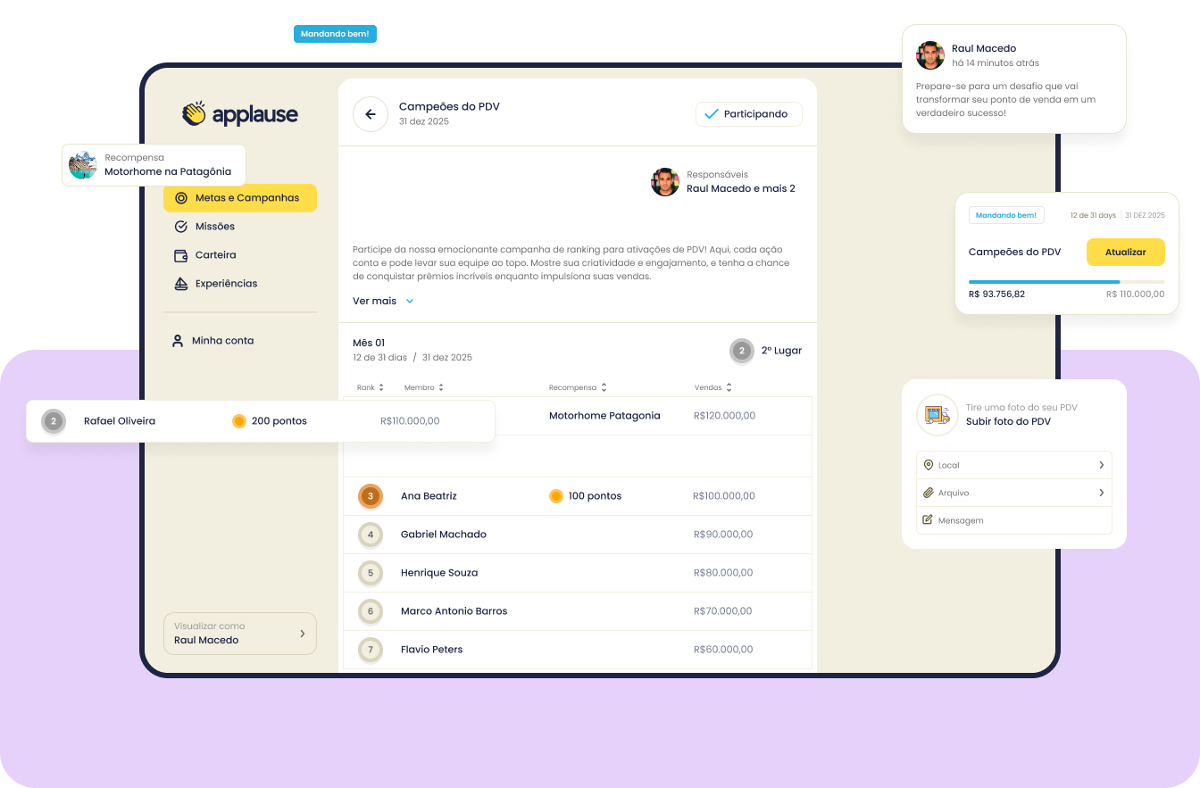 Com a Applause, crie campanhas em poucos cliques. De rankings a metas personalizadas. Além disso, comunique-se diretamente com sua equipe por comunicados segmentados, e-mail e push notifications, garantindo engajamento constante e resultados mais rápidos.